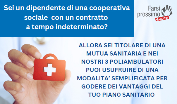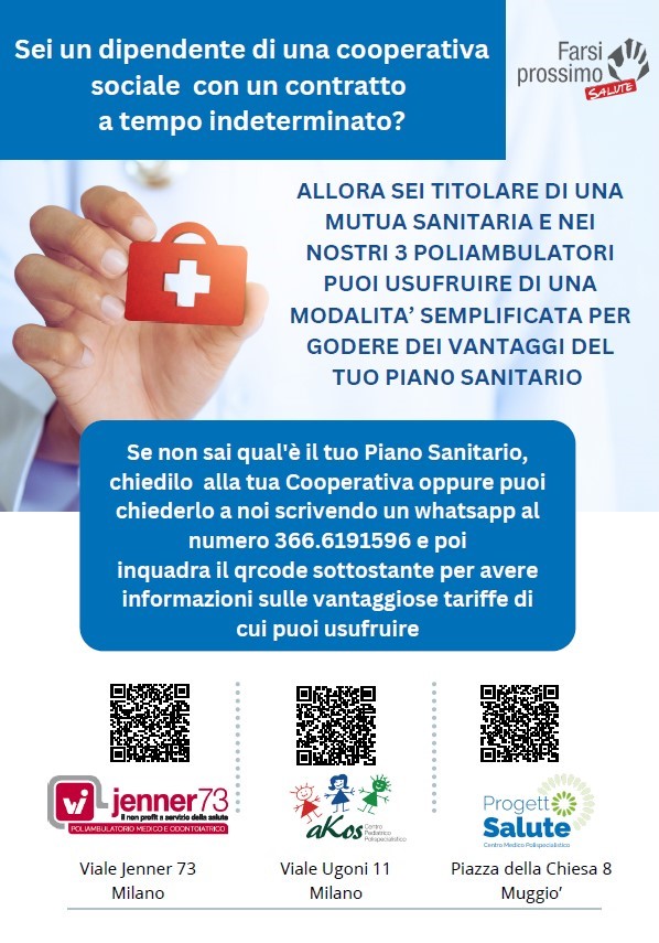 | Conosci la tua assicurazione sanitaria gratuita presso i centri di Farsi Prossimo Salute? | | Lo sai che, se sei dipendente di una cooperativa sociale, hai diritto a molte agevolazioni e rimborsi per le tue spese sanitarie? A tutti i lavoratori a tempo indeterminato presso una cooperativa sociale è garantita una assicurazione sanitaria integrativa e nei 3 ambulatori di Farsi Prossimo Salute puoi usufruire di una modalità semplificata per godere dei vantaggi del tuo piano sanitario. Se non lo sapevi, e vuoi saperne di più, chiedilo alla tua cooperativa oppure scrivi un messaggio whatsapp al numero 366.6191596. I nostri tre poliambulatori si trovano a Milano (in viale Jenner 73 e il centro pediatrico Akos in viale Ugoni 11) e a Muggò (Progetto Salute, in piazza della Chiesa 1).