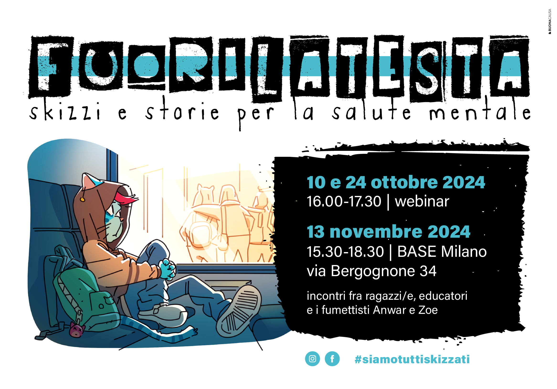 | | Un percorso interattivo di riflessione, confronto e sensibilizzazione, pensato per rendere protagonisti i ragazzi sulla salute mentale, spesso fragile alla loro età. Consorzio Farsi Prossimo promuove Fuori la testa. Skizzi e storie per la salute mentale, un percorso in tre incontri con educatori e due giovani fumettisti amati dai ragazzi, Anwar e Zoe. Destinatari ragazze e ragazzi tra i 17 e i 21 anni. I primi due incontri saranno dei webinair: si terranno il 10 e il 24 ottobre, dalle 16 alle 17.30, mentre il terzo incontro sarà in presenza, il 13 novembre, dalle 15.30 alle 18.30, a BASE Milano, in via Bergognone 34. Il percorso è organizzato nell'ambito delle campagne Fuori la testa e #nonsonoemergenza della Fondazione Con i Bambini, in collaborazione con Caritas Ambrosiana, con il contributo di Fondazione Cariplo. Fuori la testa Skizzi e storie per la salute mentale è anche uno degli eventi della rassegna del Comune Milano 4 Mental Health, organizzato in occasione della Giornata mondiale per la salute mentale del 10 ottobre.