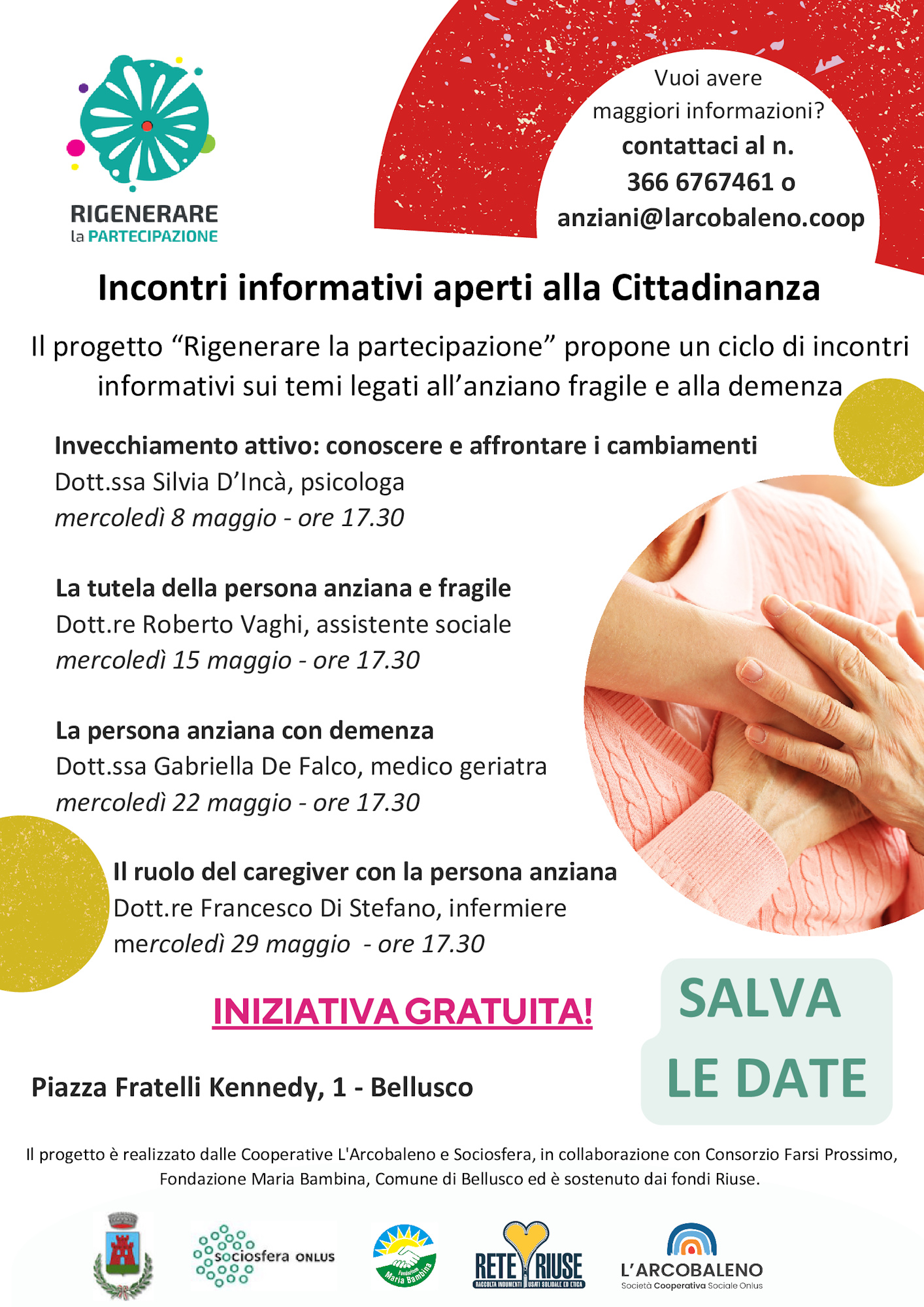 Gli incontri, totalmente gratuiti e ad accesso libero, fanno parte del progetto Rigenerare la partecipazione, realizzato dalle cooperative L'Arcobaleno e Sociosfera, in collaborazione con Consorzio Farsi Prossimo, e Fondazione Maria Bambina. Le cooperative L'Arcobaleno e Sociosfera – entrambe socie di Consorzio Farsi Prossimo – gestiscono sul territorio il Centro Diurno Integrato e gli appartamenti del Centro Maria Bambina.L’obiettivo generale del progetto Rigenerare la partecipazione consiste nel contribuire ad aumentare la capacità del territorio belluschese di intercettare e rispondere ai bisogni delle persone anziane, anche fragili e a rischio isolamento, e delle persone che vivono con demenza attraverso l’implementazione di servizi ed iniziative di sensibilizzazione della comunità.